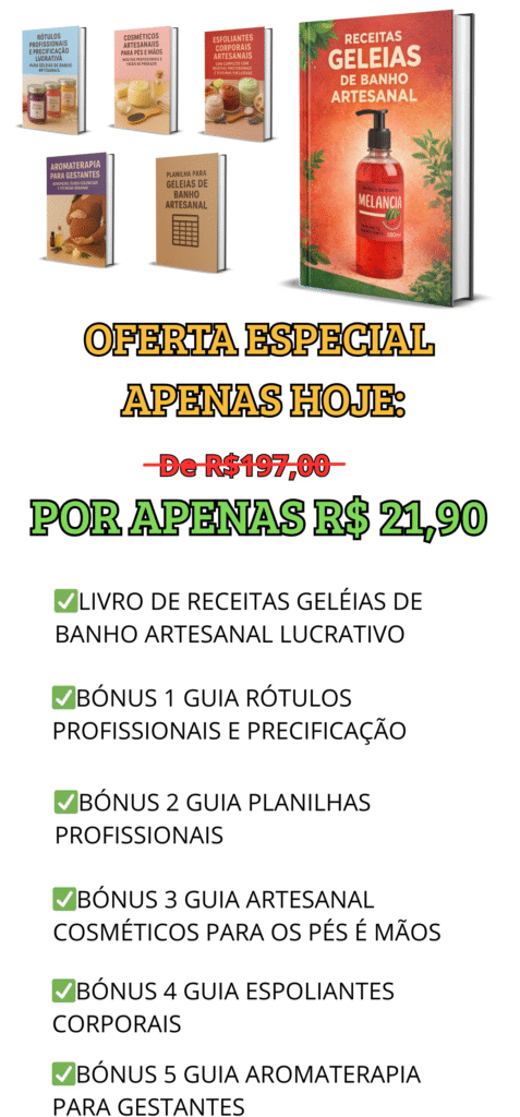 É um guia digital completo que ensina, de forma prática e direta, como produzir geleias de banho artesanais do zero.